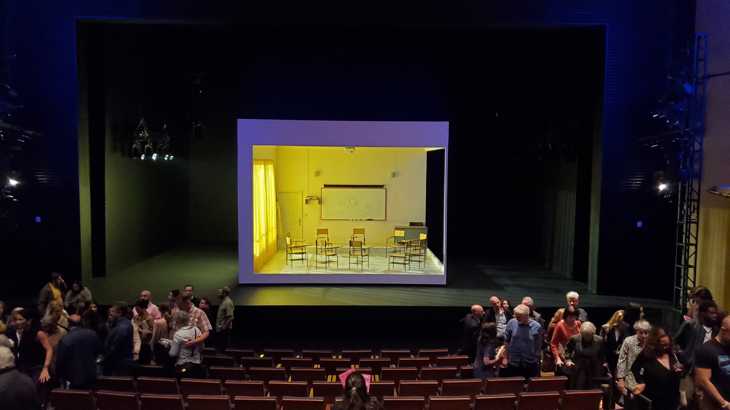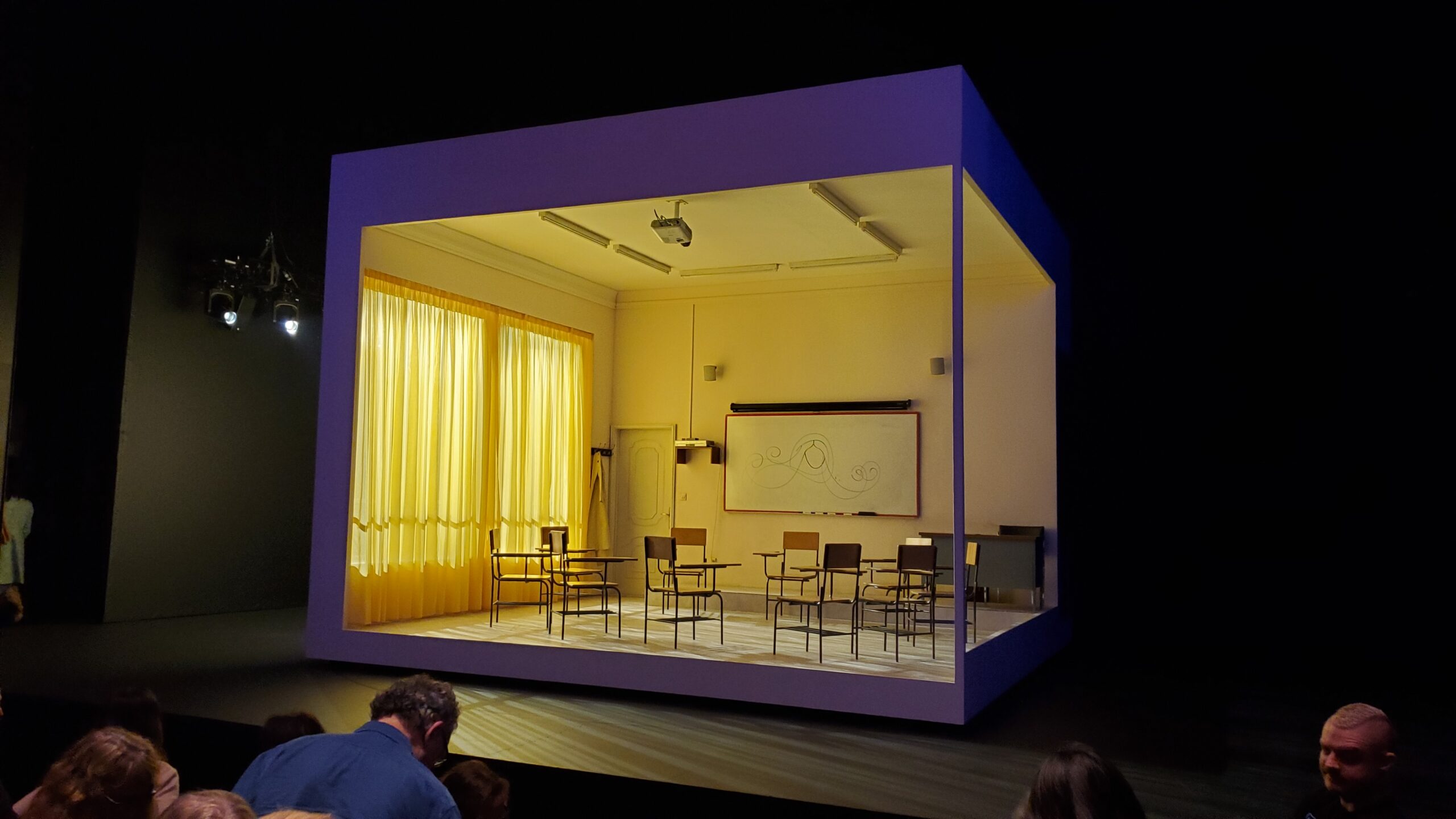 The rotation of the set (I was right) not only showed the whole classroom setting, but showed the passage of time and the changing of scenes. It would rotate a little bit one way, or a little bit the other way, while the actors would adjust the curtains and the lighting would shift from morning to night to midday. It truly felt like different camera angles across weeks of time–very clever lighting and staging. Since the room was full of desks and chairs, the actors could also move them around to create different environments right for each scene.