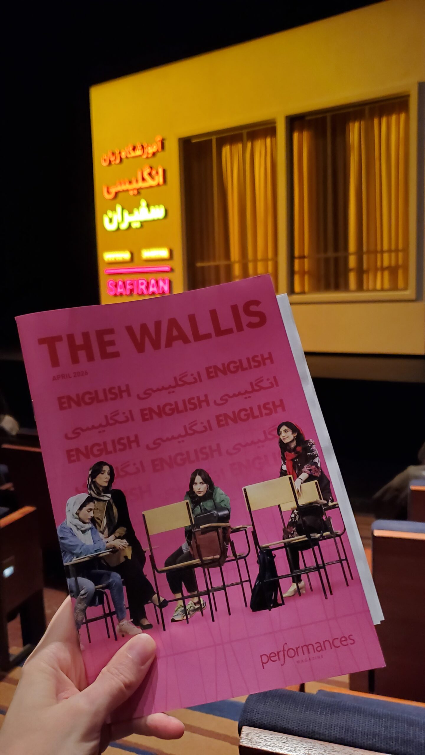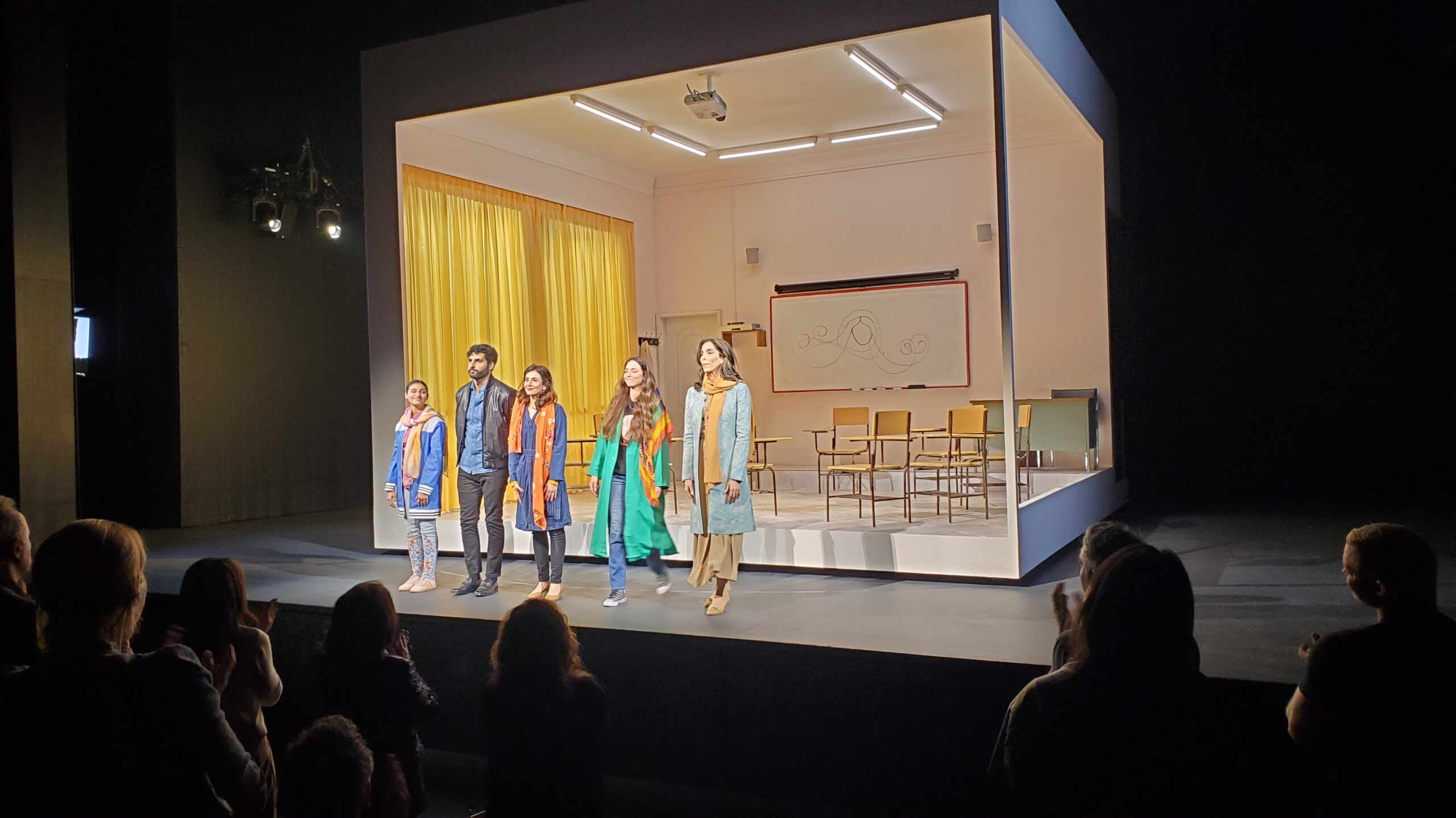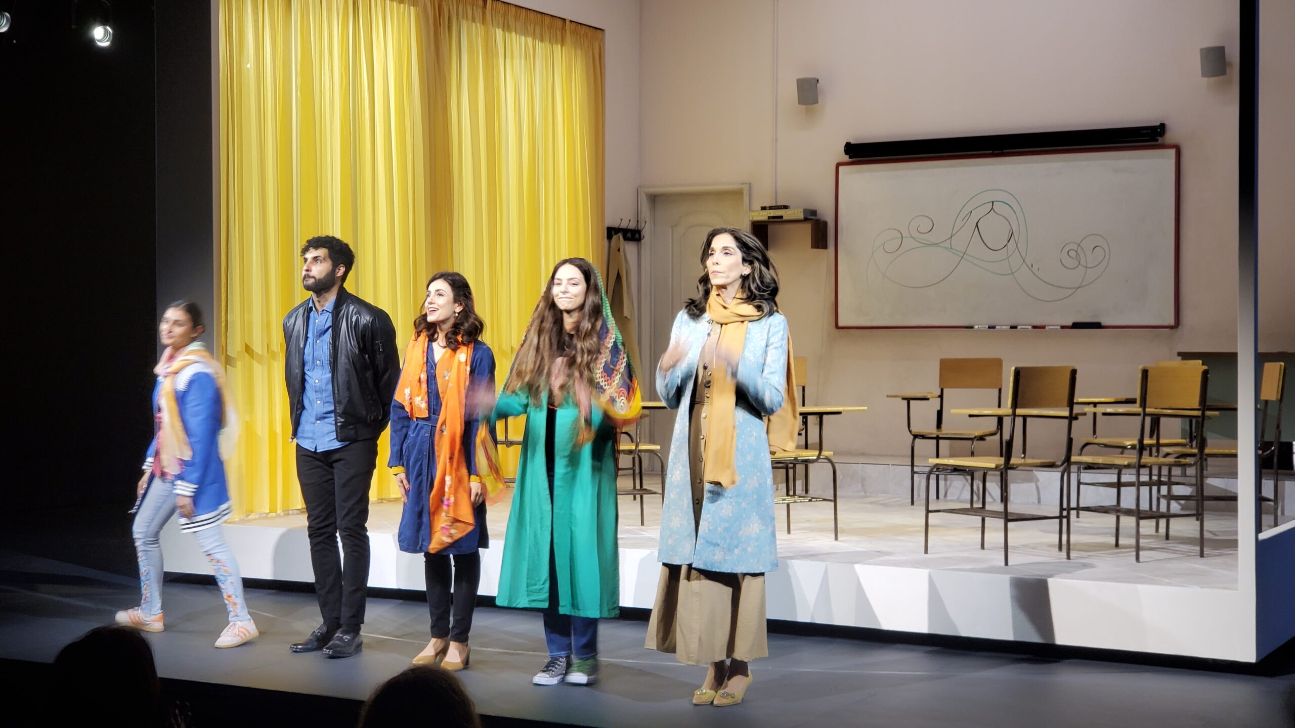 This was a play I came into completely blind. I didn’t know a thing about it other than the ads, which featured the name “English,” the word “English” in Persian script, and four Iranian actresses in a classroom setting. (The fifth character, a guy, was not in the ads.)