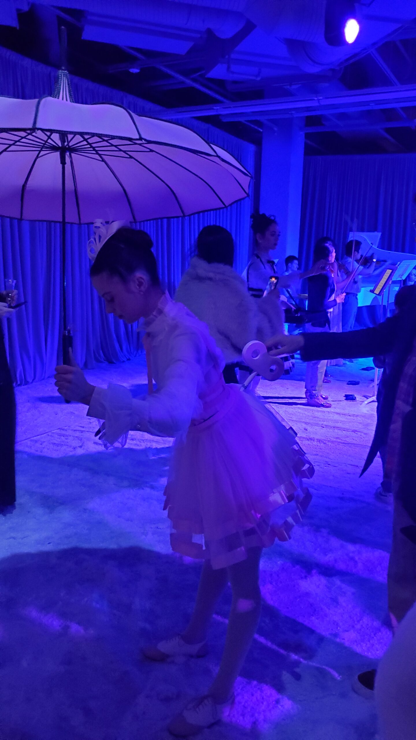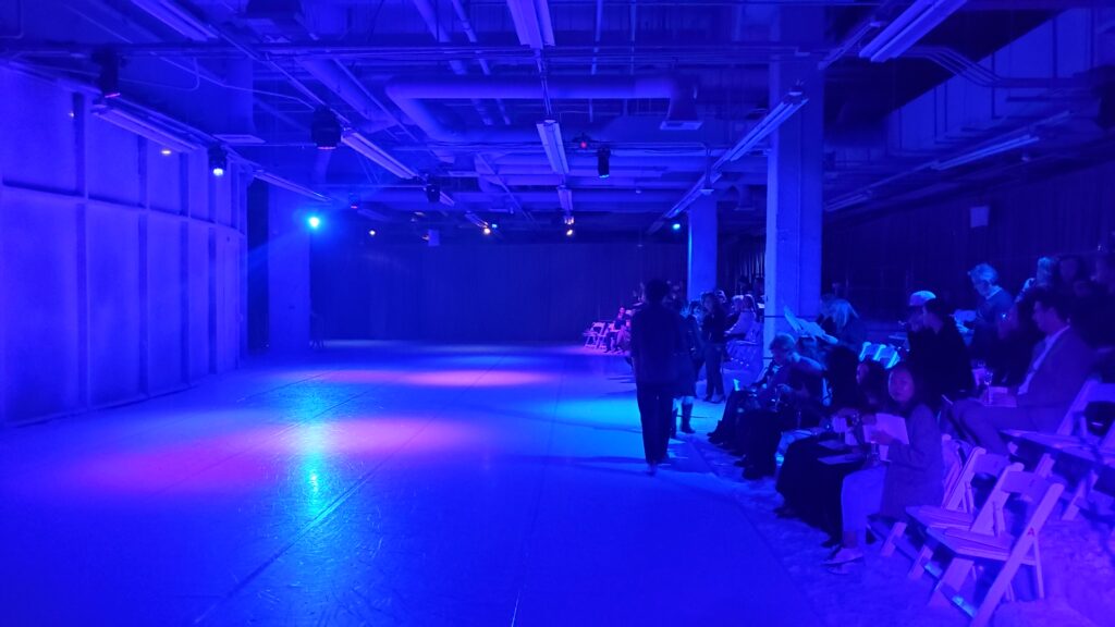 The crowd filtered into the performance space, a long and intimate stage right up against the seating, without any real separation. There were ballerinas on roller skates, meant to conjure images of ice skating, doing loops around the performance area. There was fake snow on the ground, and the room was bathed in a deep blue light, with a muted white winter light glowing from behind the stage.