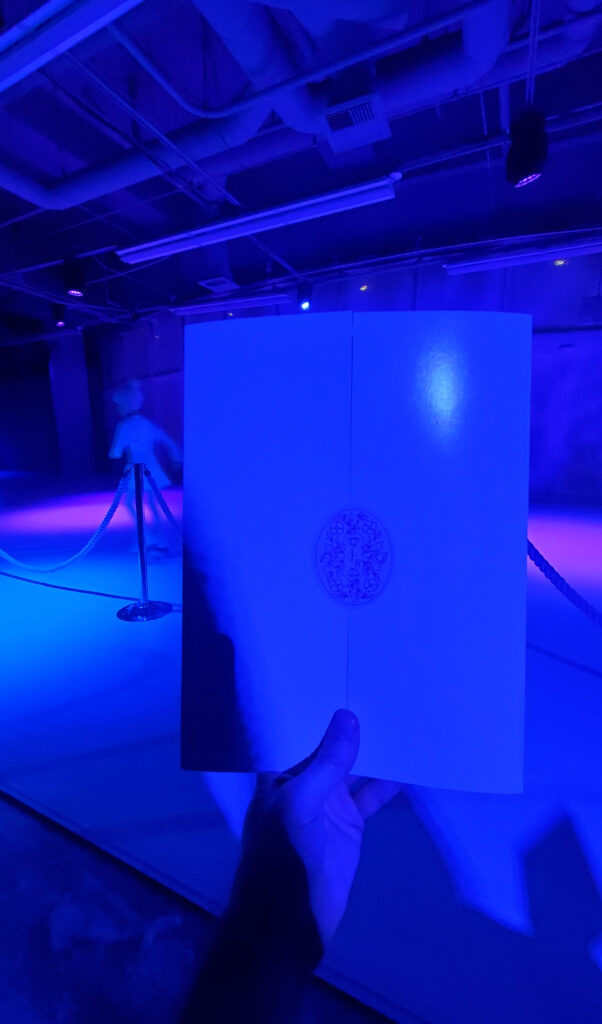 Stepping outside, it’s a short curved walk until I arrive back inside, in a new area. This area already has a few dozen people waiting around (it’s about 20 minutes before showtime), but I am first greeted by a ballerina at a large wooden desk. The desk is mostly empty, other than some generic office supplies and a bright red telephone; in fact, the whole room seems to be a little empty, like it was usually unoccupied, as if someone had put up quick corporate dressing over a vacant office space.