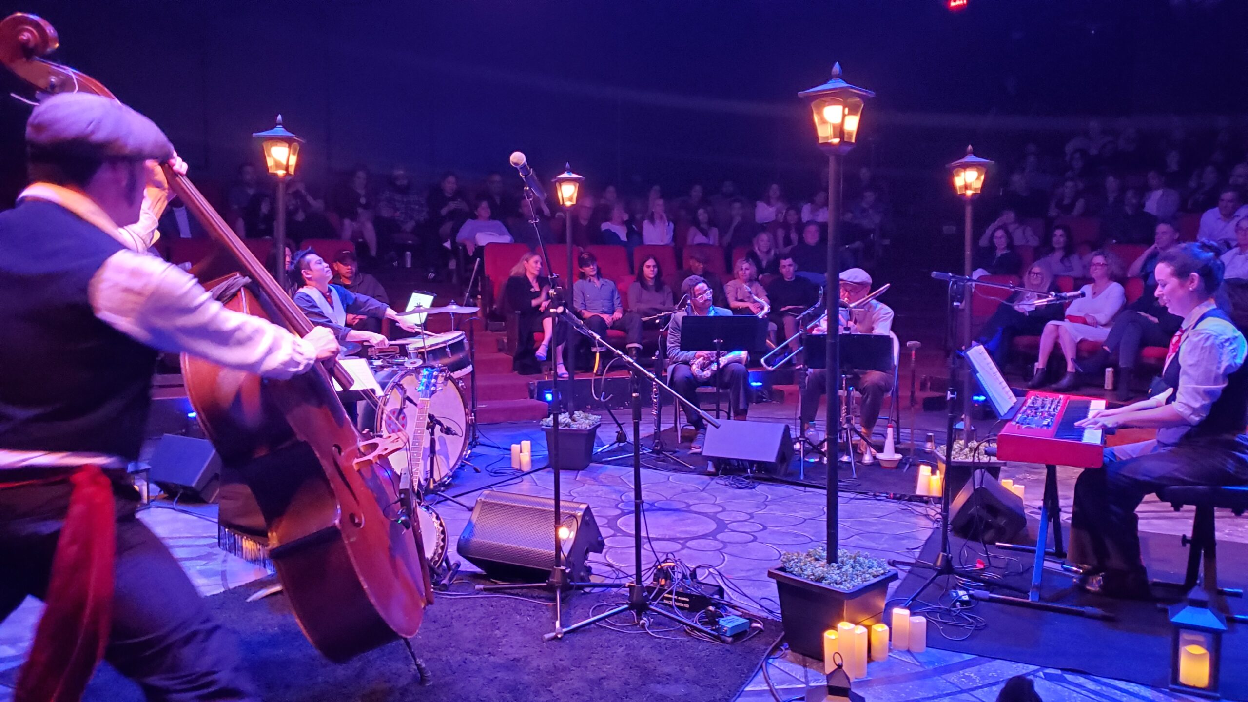 The instrumentalists shifted for Thanksong. This arrangement featured a new female vocalist, and then the same violinists, cellist, and violaist, but now in brand new scattered standing positions across the stage.
