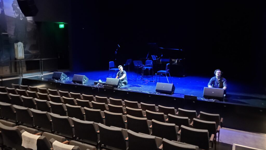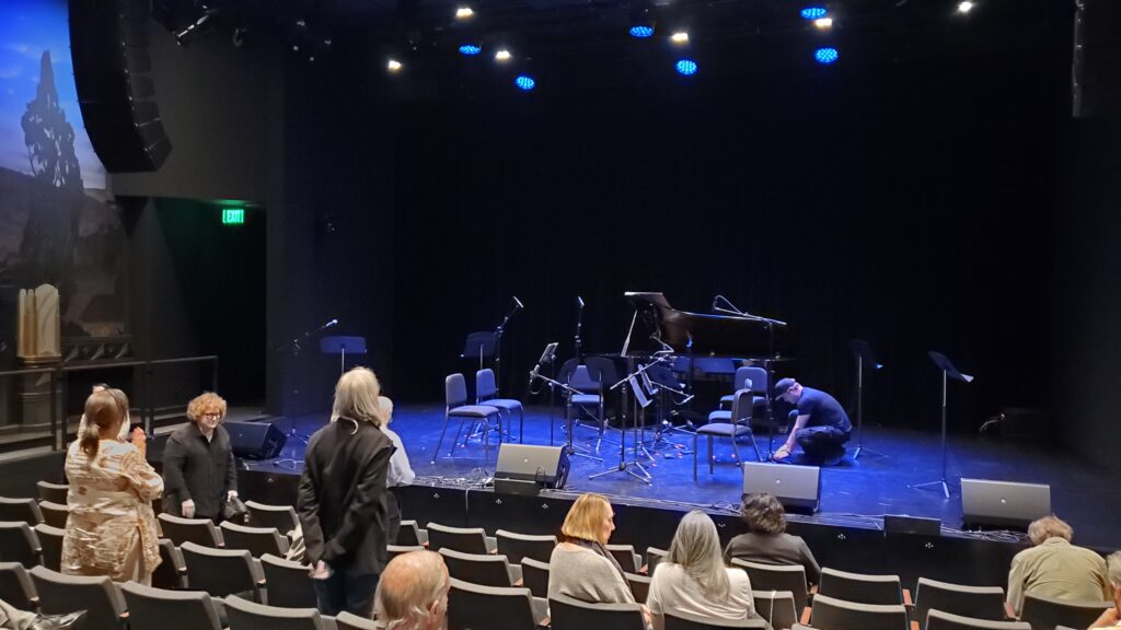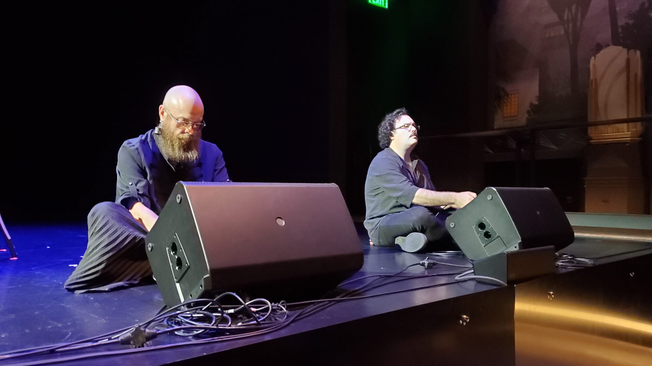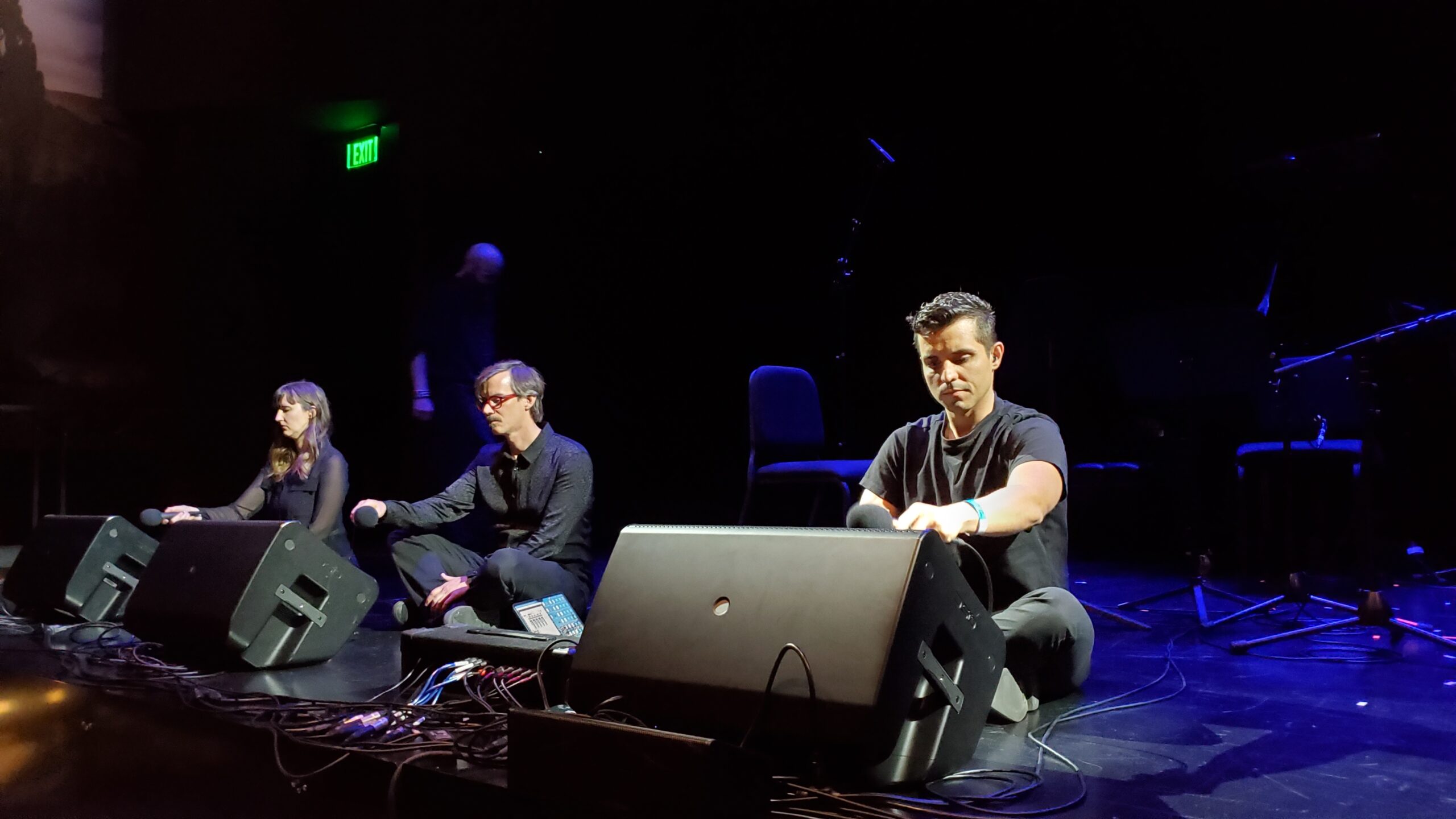 As I entered, five musicians were sitting in front of the monitor speakers on stage, microphones pointed at the monitors themselves, and they were making noise…