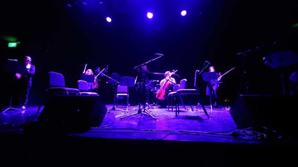 The title of this particular concert series–which I should also mention was being put on by CAP UCLA, CAP standing for the Center for the Art of Performance–was called “Perfect Offering.” Prelude aside, Act 1 was to be two works of “immersive spectralism” by composer Catherine Lamb, who is from Olympia, Washington. Act 2 was then three works from composer Cassandra Miller, inspired by “tape loops and birdsong to Leonard Cohen and Beethoven’s Op. 132.”