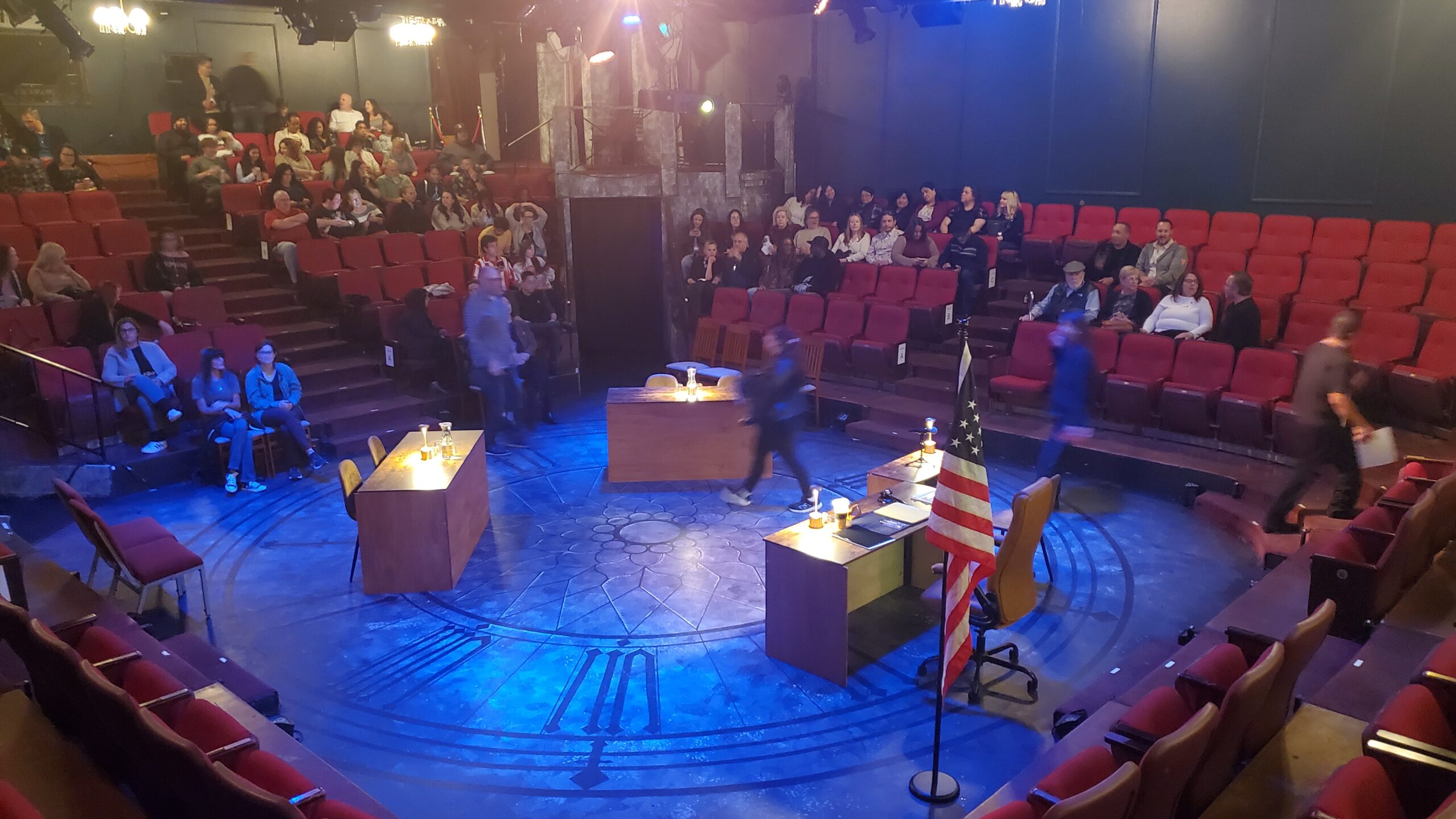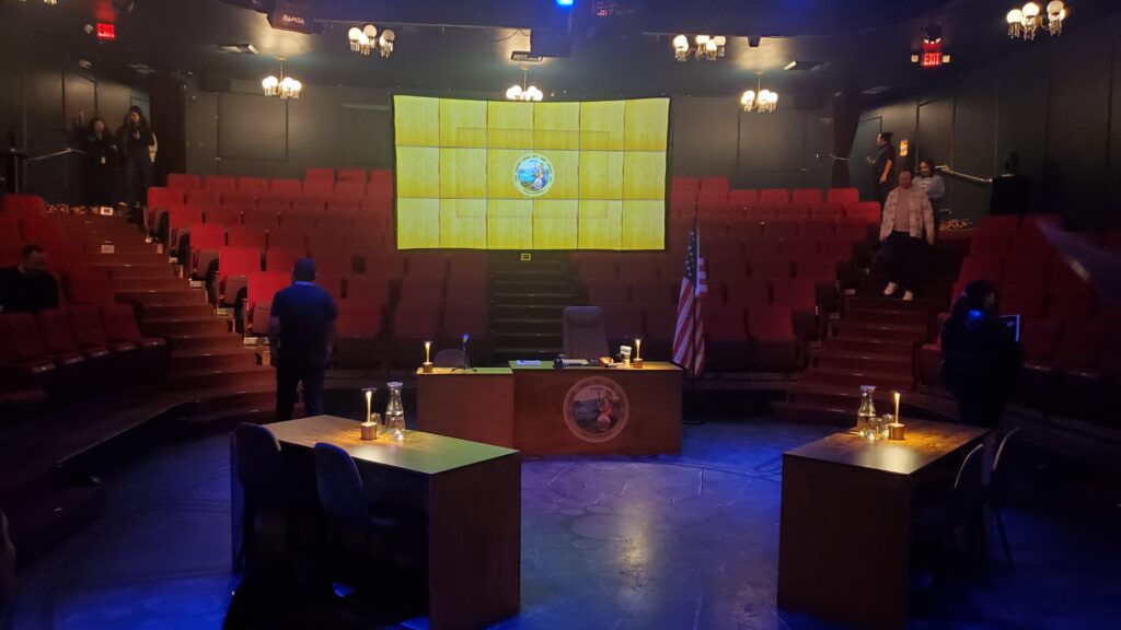 I had been at the Nocturne just last month for Madam Scrooge, and while all of the Christmas decorations had been put away, there were still some remnants of the production, mostly the old Victorian clock face painted on the floor of the stage. This felt like an appropriate decoration for a trial, too, so that actually added to the experience. The lobby was the least decorated I’ve ever seen it, without any holiday accessories or dressings for upcoming shows.