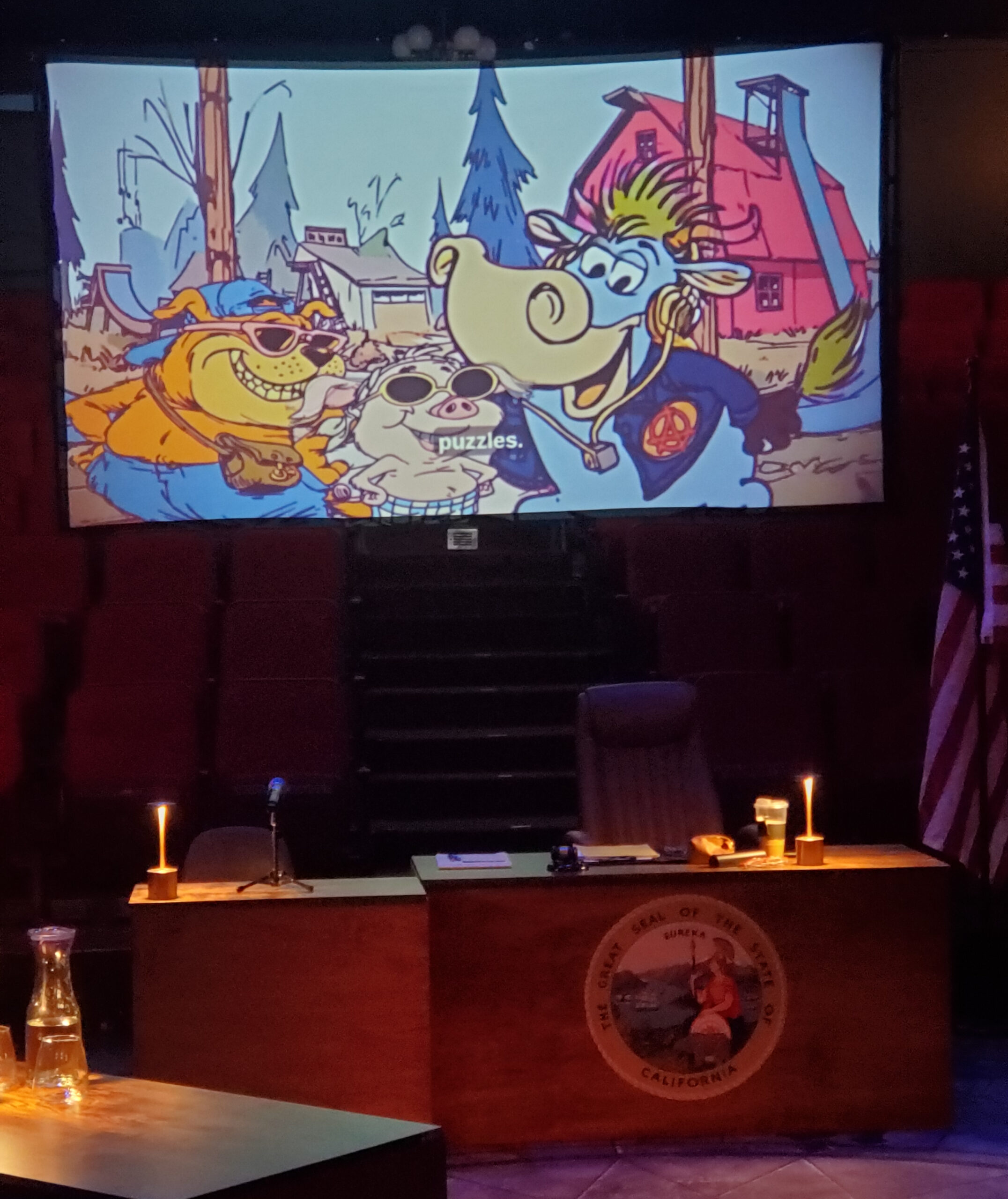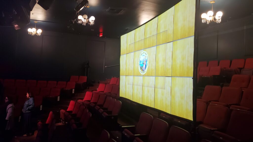 I immediately noticed the large screen mounted up over one of the seating quadrants. I didn’t expect to be seeing a presentation tonight, but then, what did I expect?